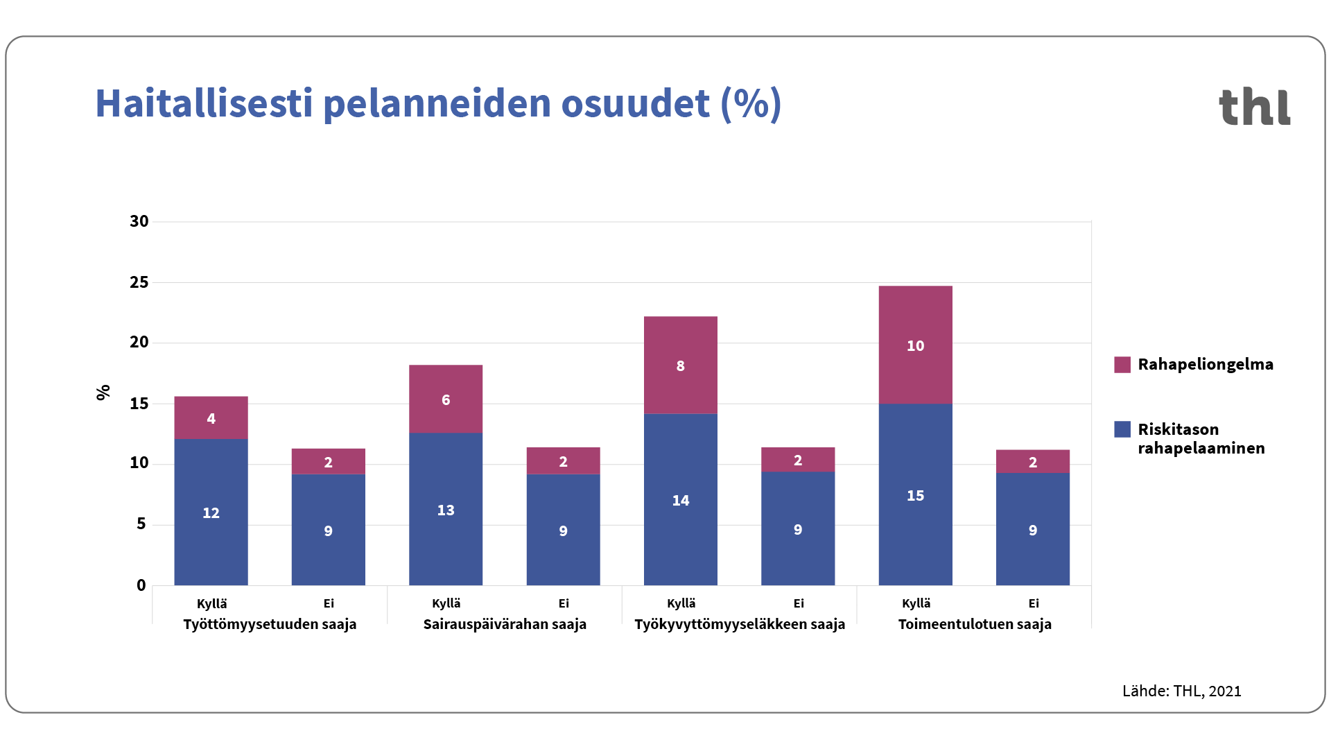 Tuoreen tutkimusartikkelin mukaan rahapeliongelma ja riskitasolla pelaaminen ovat yhteydessä sosiaalietuuksien saamiseen. Tarkasteltavat sosiaalietuudet sisälsivät työttömyysetuuden, sairauspäivärahan, työkyvyttömyyseläkkeen sekä toimeentulotuen. Haitallisesti pelaavien osuus oli suurempi henkilöillä, jotka olivat saaneet sosiaalietuuksia. Kaavio: THL