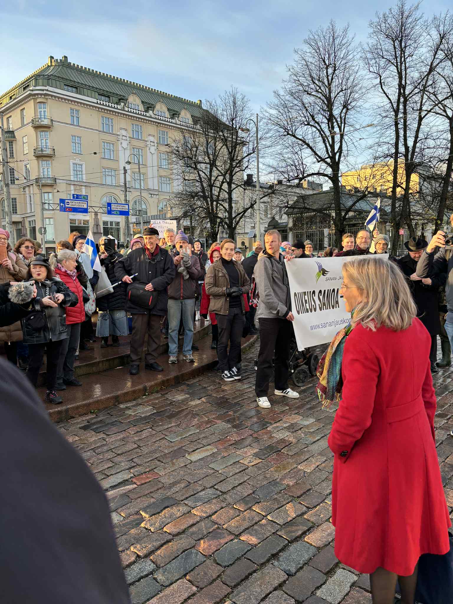 Päivi Räsänen ehti matkallaan korkeimpaan oikeuteen osallistua häntä tukevaan mielenilmaukseen. ”Oikeus sanoa, vapaus uskoa”, luki tukijoiden banderollissa. (Kuva Ossi Lehtihuhta)