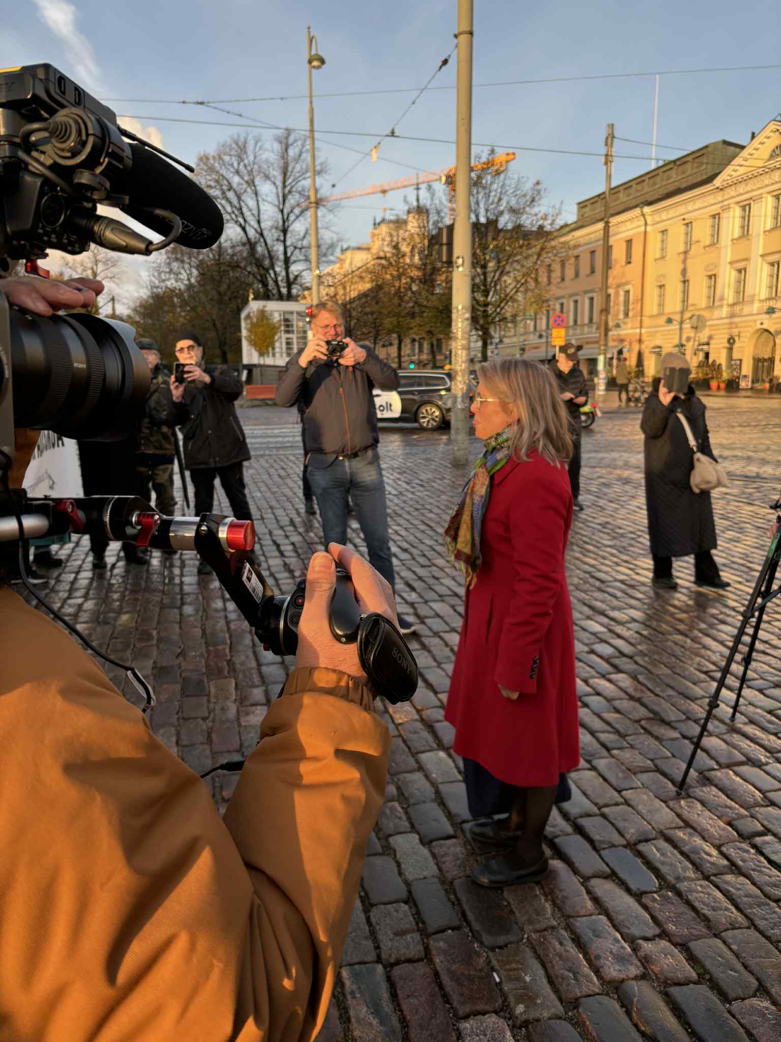 – Lämmin kiitos teille! Ihanaa, aurinkokin paistaa! Ihana sää saatiin tähän. Hienoa, että olette mieltä osoittamassa.