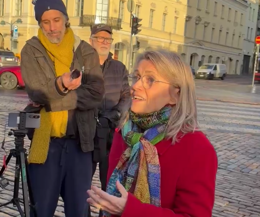 – Jumala haluaa kaikille ihmisille hyvää. Hän haluaa pelastaa ihmiset. Sen vuoksi on niin tärkeää, että voidaan pitää esillä Jumalan sanaa, Päivi Räsänen perusteli median ja tukijoiden edessä. (Kuva Ossi Lehtihuhdan kuvaamasta videosta)