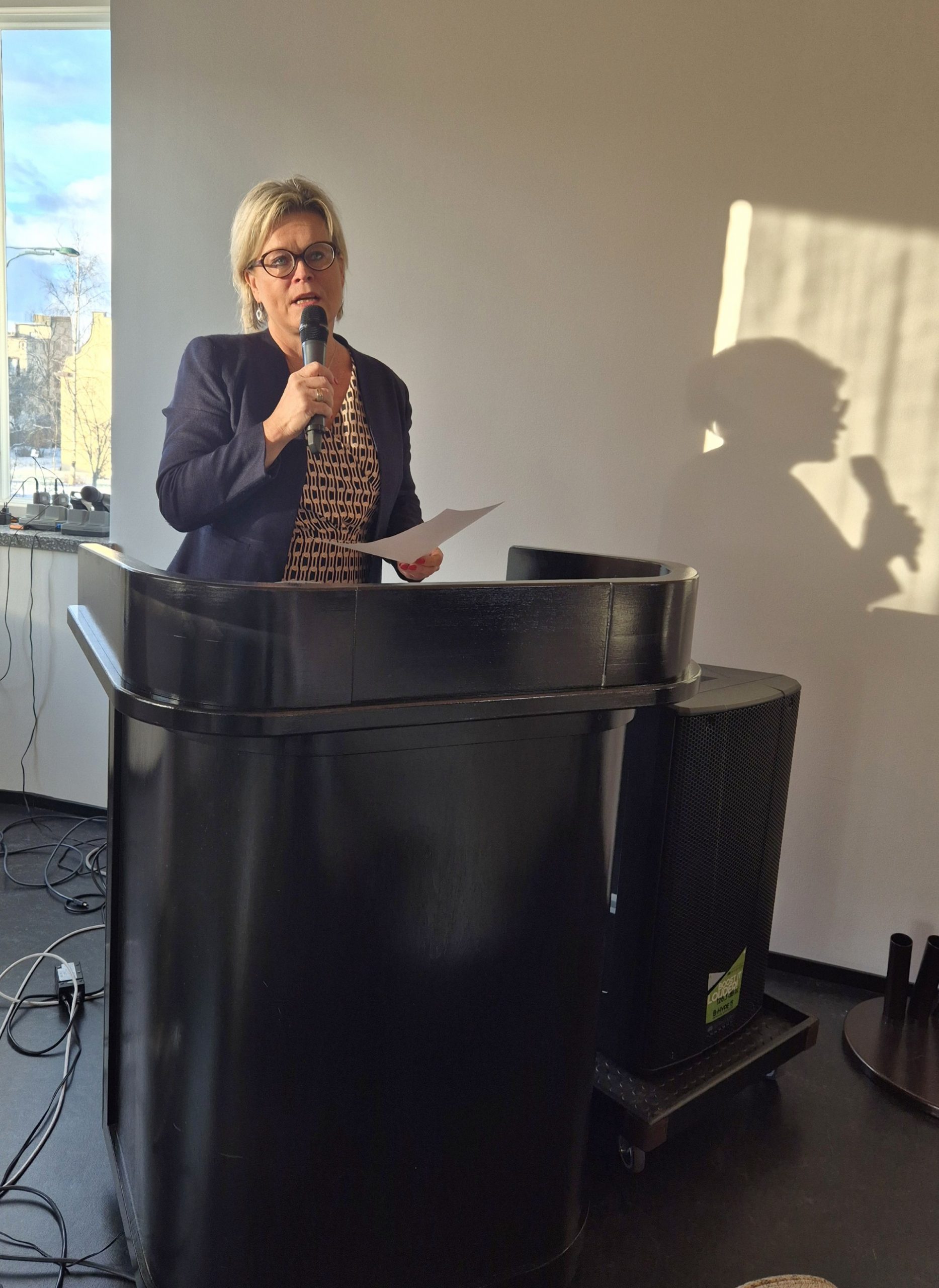 Lääkäri-kansanedustaja, Tampereen kaupunginvaltuutettu ja Pirkanmaan aluevaltuutettu Sari Tanus piti poliittisen katsauksen piirin kokouksessa. (Kuvat Mikko Rekimies)
