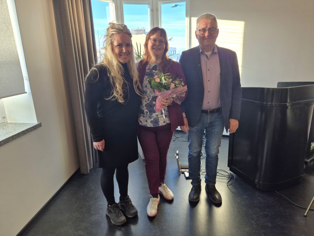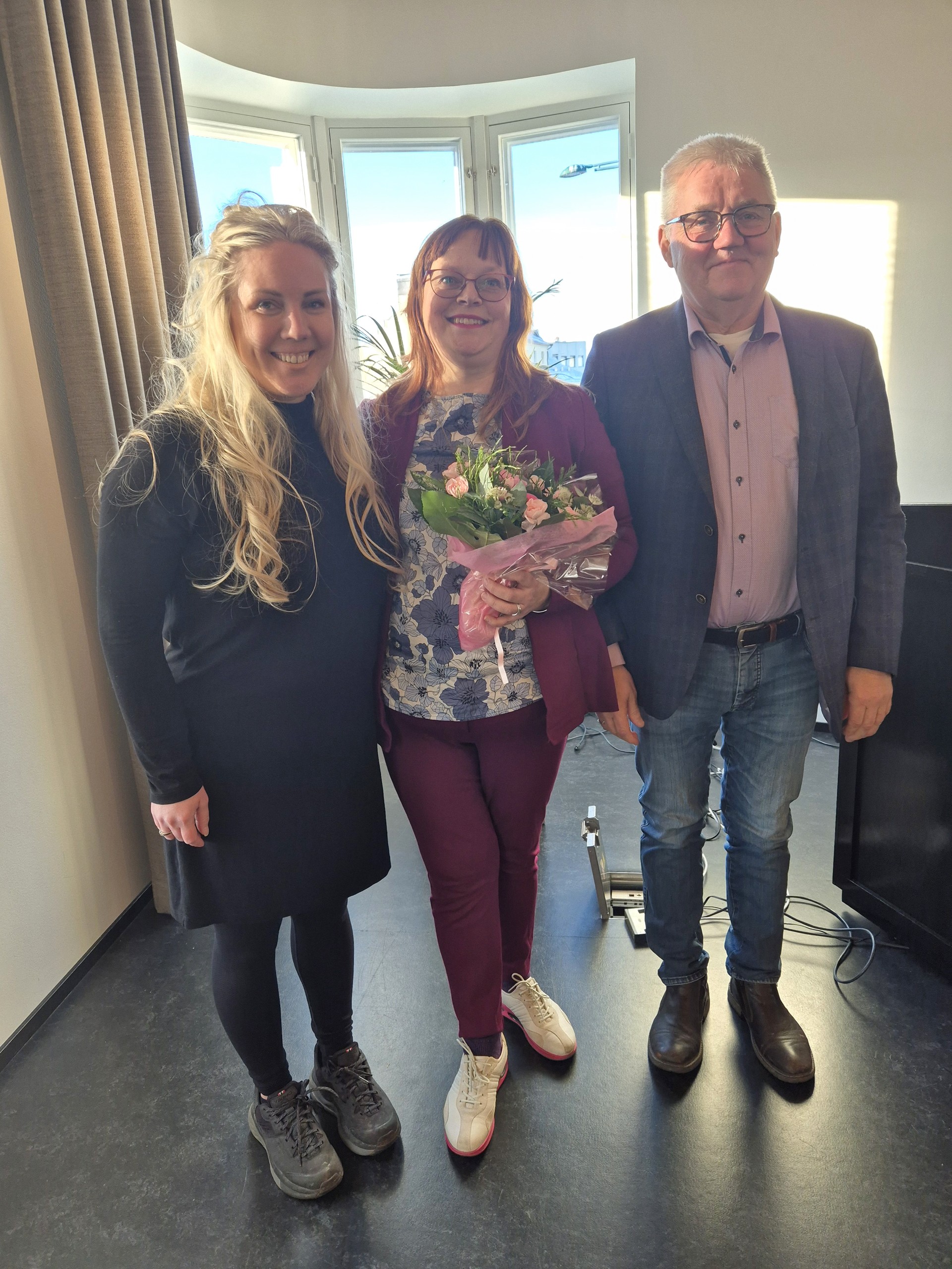 Aura Elliott (keskellä) valittiin jatkokaudelle puheenjohtajana ja Kauko Turunen varapuheenjohtajana. Elina Kähäri toimi kukittajana. Elliott on aiemmin toiminut Vesilahden valtuustossa. Turunen on Parkanon kaupunginvaltuutettu ja Pirkanmaan aluevaltuutettu. (Kuva Mikko Rekimies)
