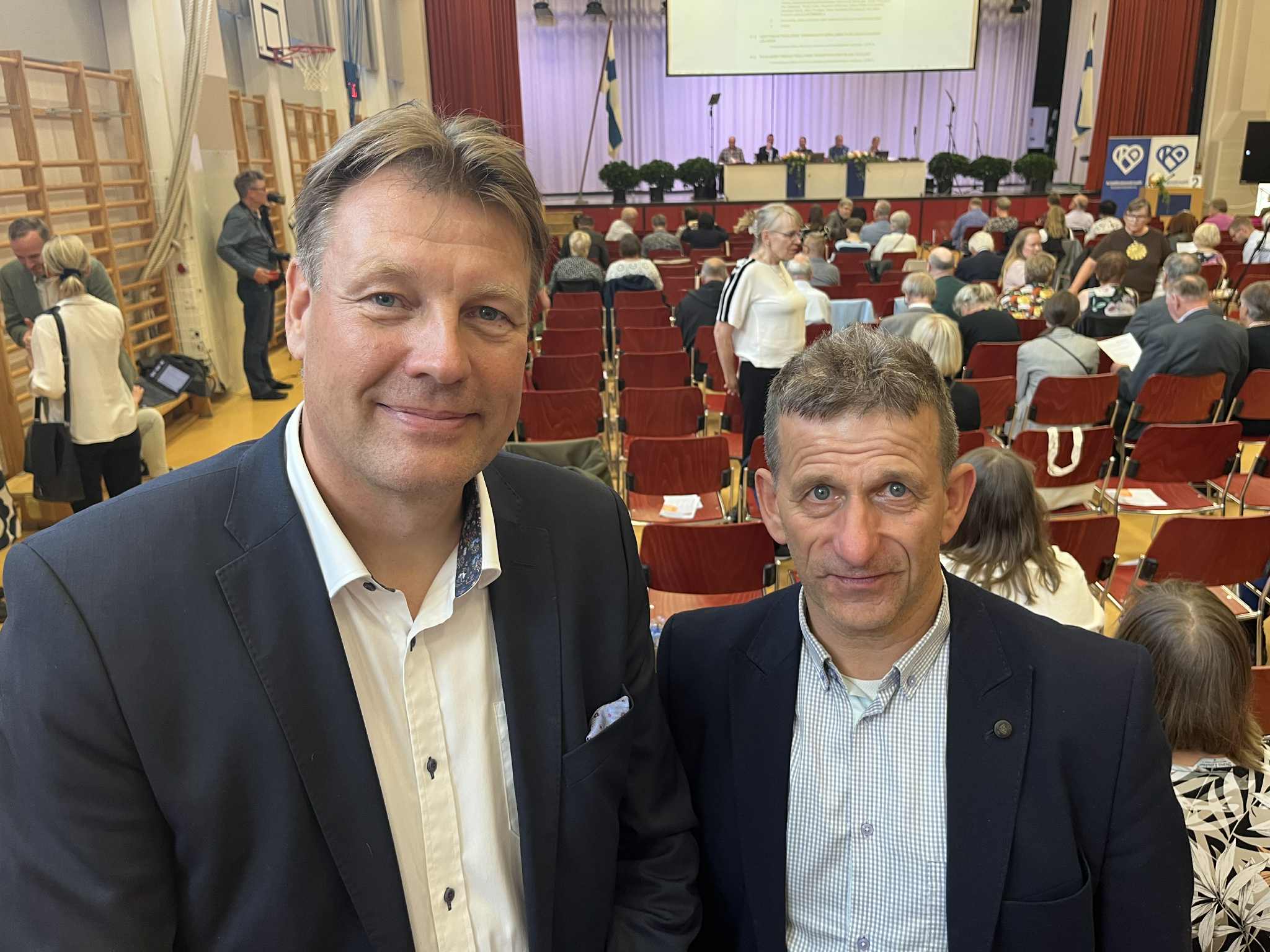 Valtuustokollegat, Savonlinnan kaupunginvaltuutetut Jarmo Puustinen ja Jouni Koskelan Kristillisdemokraattien puoluekokouksessa Porissa elokuussa. (/Kuva Kristiina Kunnas)