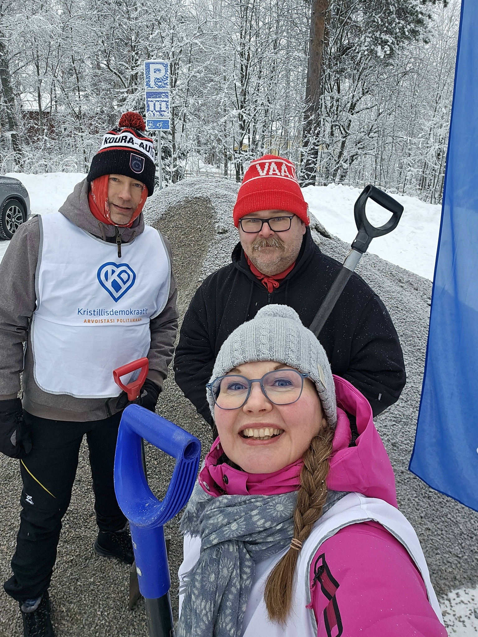 KD-väki auttoi lapioimisessa. Mervi Turusen seurassa Kauno Riihonen ja Marko Luomala.